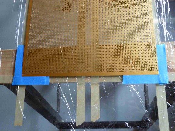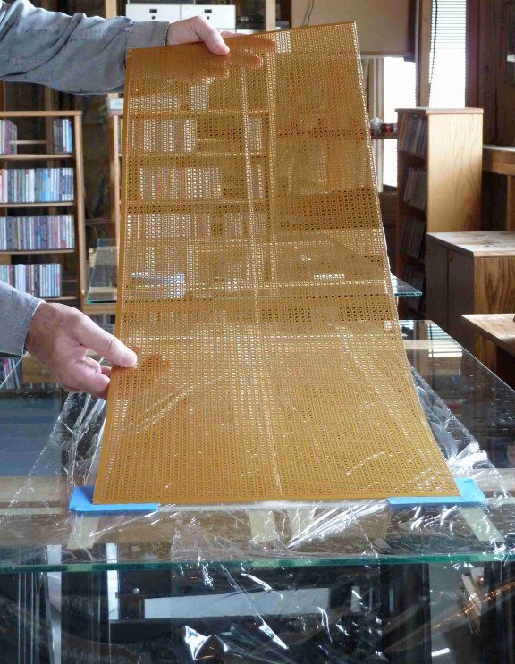 There are several gluing steps required in ESL fabrication, at least if you follow the general instructions given by Roger Sanders - you need to glue each of the two stators onto plastic spacers, and you need to bond the diaphragm on both sides to the spacers. When I first started making ESLs, one of the difficulties I encountered was how to make sure that things lined up during gluing steps. In fact, things typically did not line up very well. So for example I would find that after I lowered a stator onto the spacers, it did not quite register so I would have to slide it into the correct position, smearing the glue around in the process.