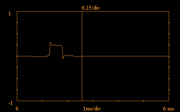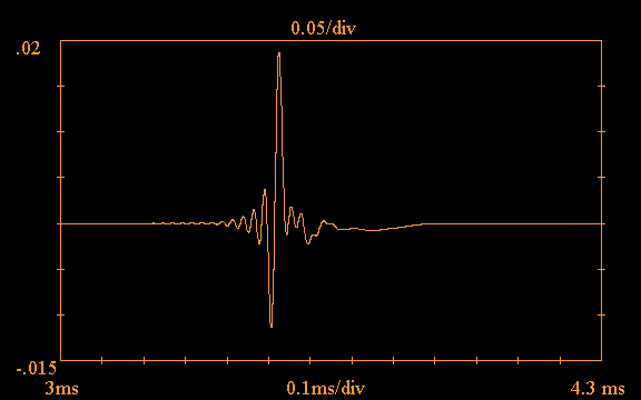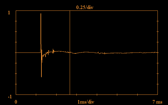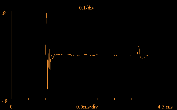 Note the vertical line at approximately 1.8ms in the above plot; the software provides the option of truncating the impulse response, in order to carry out a "quasi-anechoic" measurement. If this option is selected, the software ignores all data to the right of the truncation point, treating it as zero. This option is useful for eliminating the effects of room reflections. Such a reflection is clearly evident in the above plot just after 3.5ms.